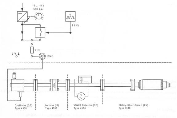 and measuring equipment 1 Microwave Trainer Type 4510 1 Oscillator (OS) Type 4506 1 Isolator (IS) Type 4509 1 VSWR Detector (SD) Type 4556 1 Sliding Short-Circuit (KV) Type 4546 1 Connecting plugs and leads Series 9100 1 Multimeter Experiment setup